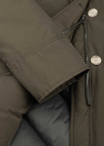 'Arctic' parka from Woolrich, water- and wind-resistant material, filled with warming down and feathers, two slanted flap pockets at the front, two inside pockets, hood with removable coyote fur and drawstring, full-length button placket and full-length zipper underneath, sleeves with elastic ribbed cuffs.