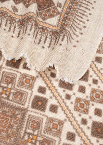 Soft wool scarf by Mel & Davis with fringes and intricate patterns.