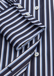 Blouse by Odeeh made of fine cotton, featuring a pointed collar, back yoke with a pinch pleat, long sleeves with wide button cuffs, a full-length button placket, and a rounded hem.