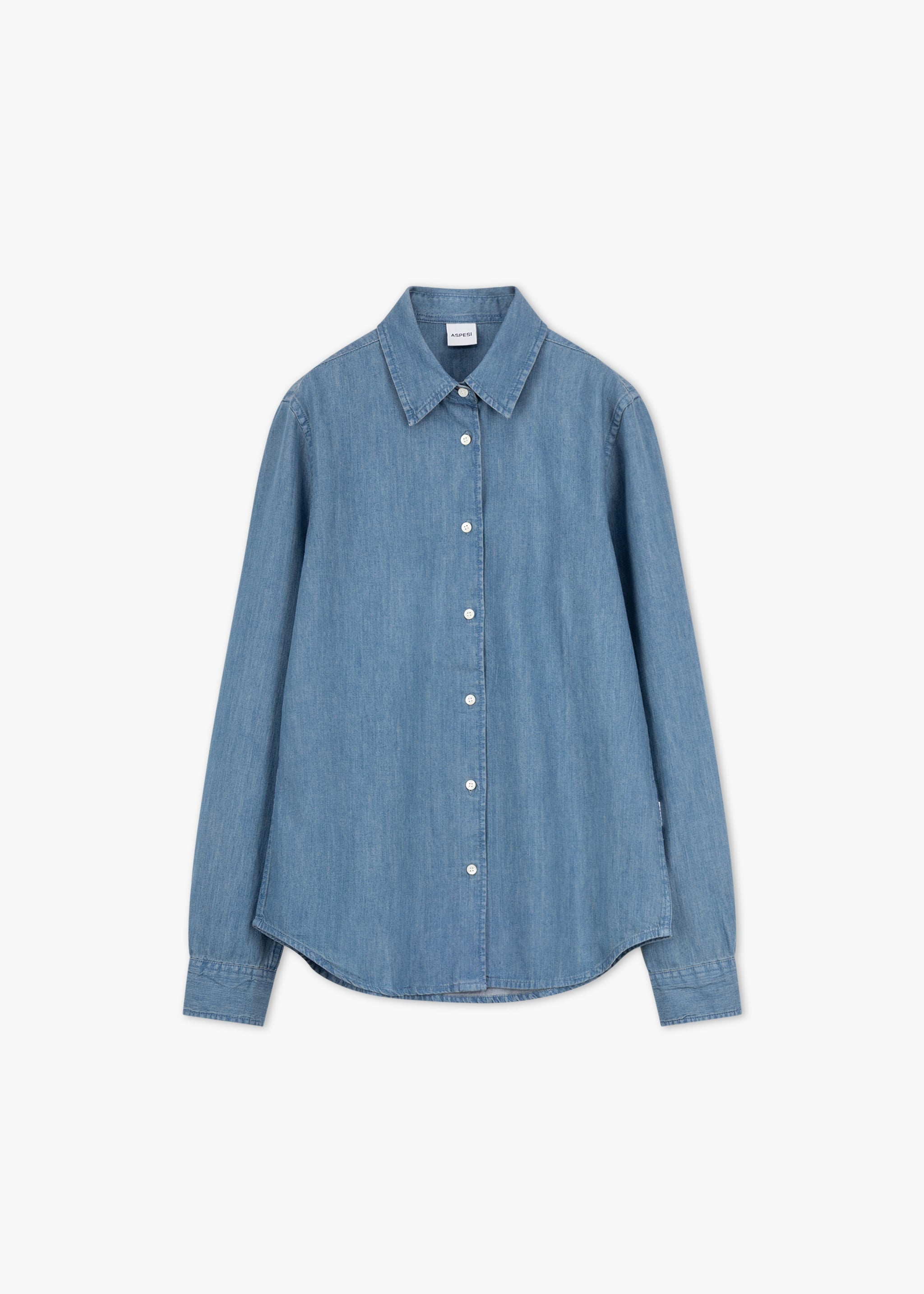 Long 'Field Shirt' by PiaLea made of cotton, classic collar, full-length button placket, back yoke, long sleeves with button cuffs, four patch pockets, straight hem with side slits.