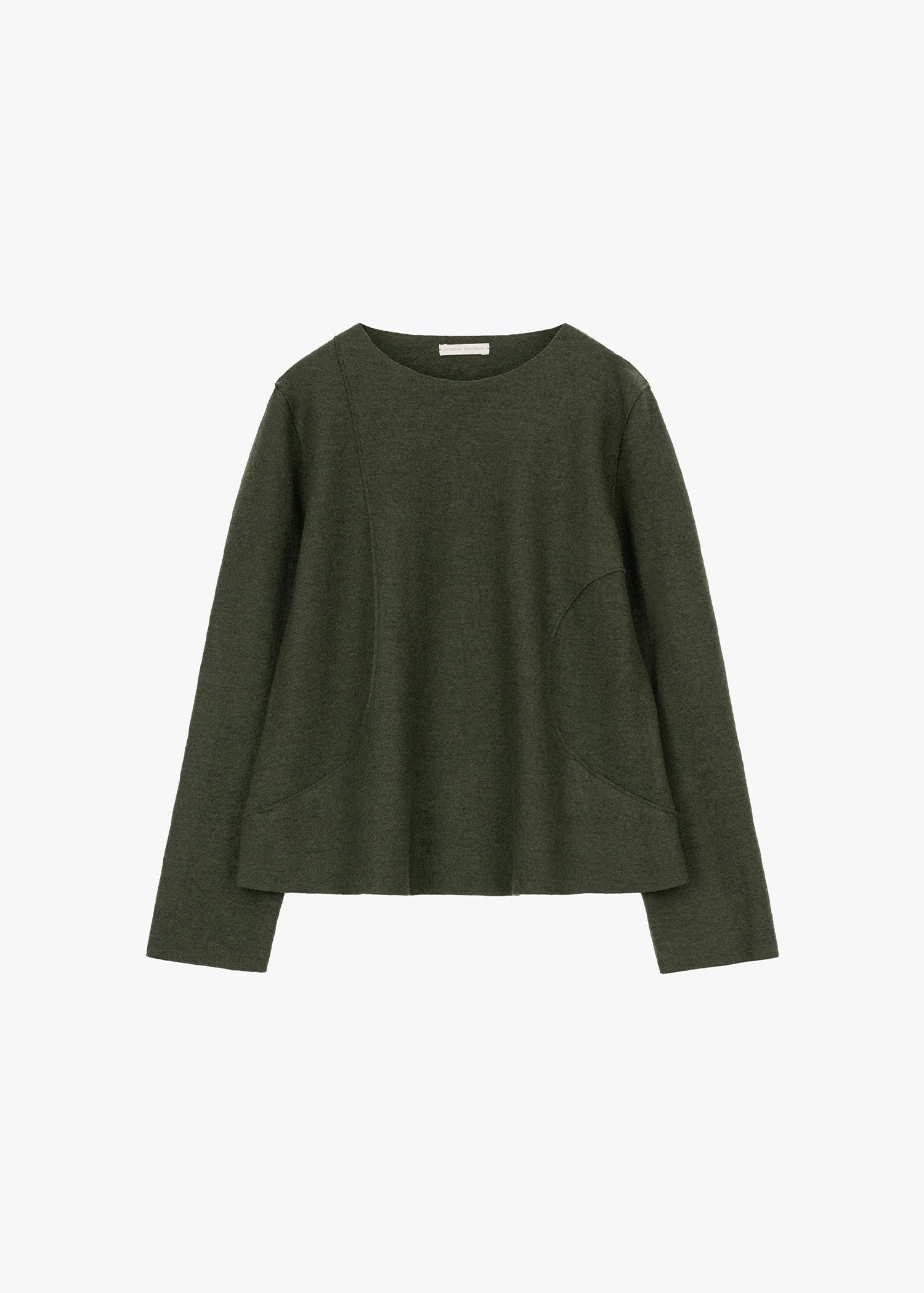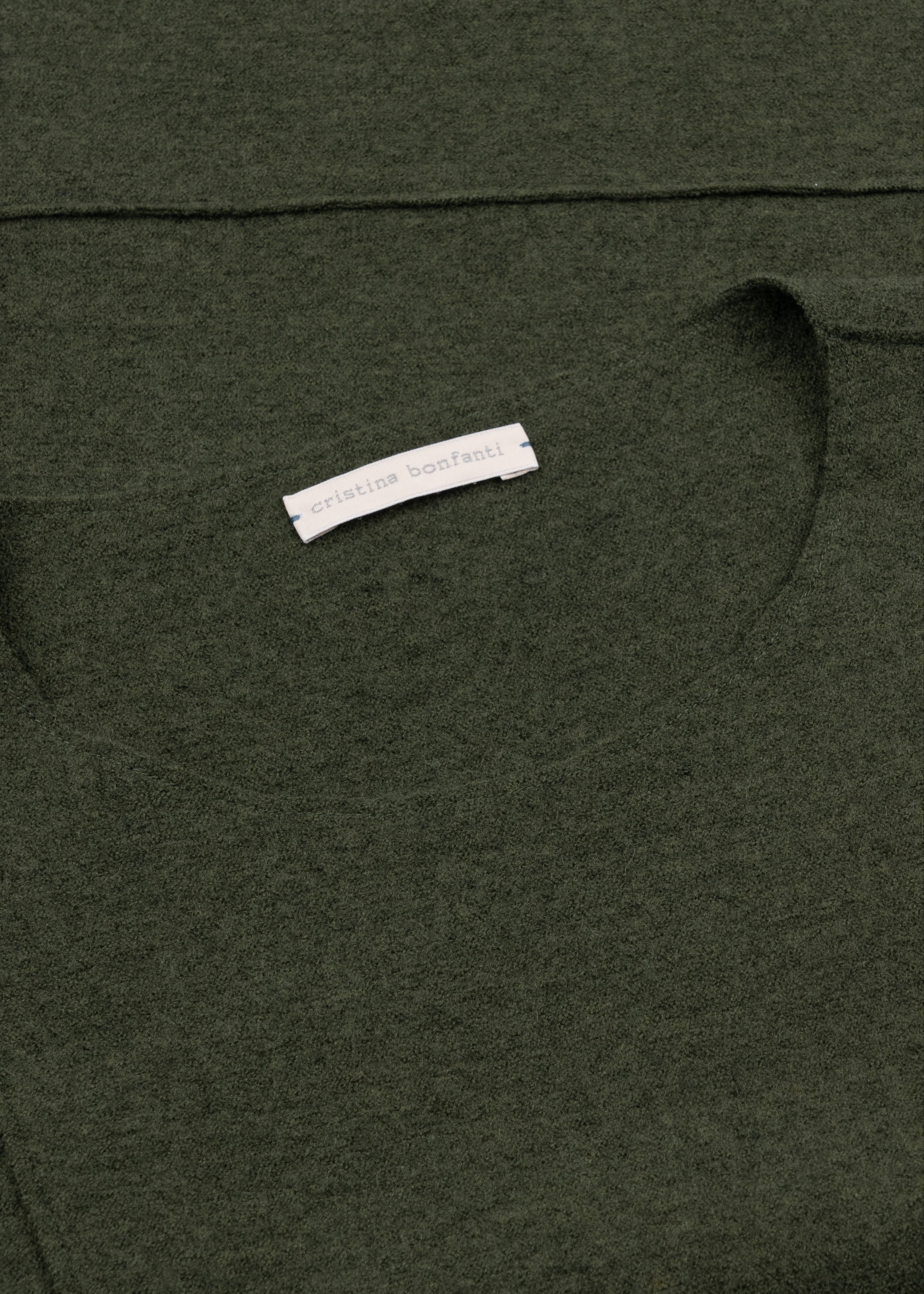 Midi loden skirt by Christina Bonfanti, elastic waistband, side pockets, topstitched decorative seams, straight hem.