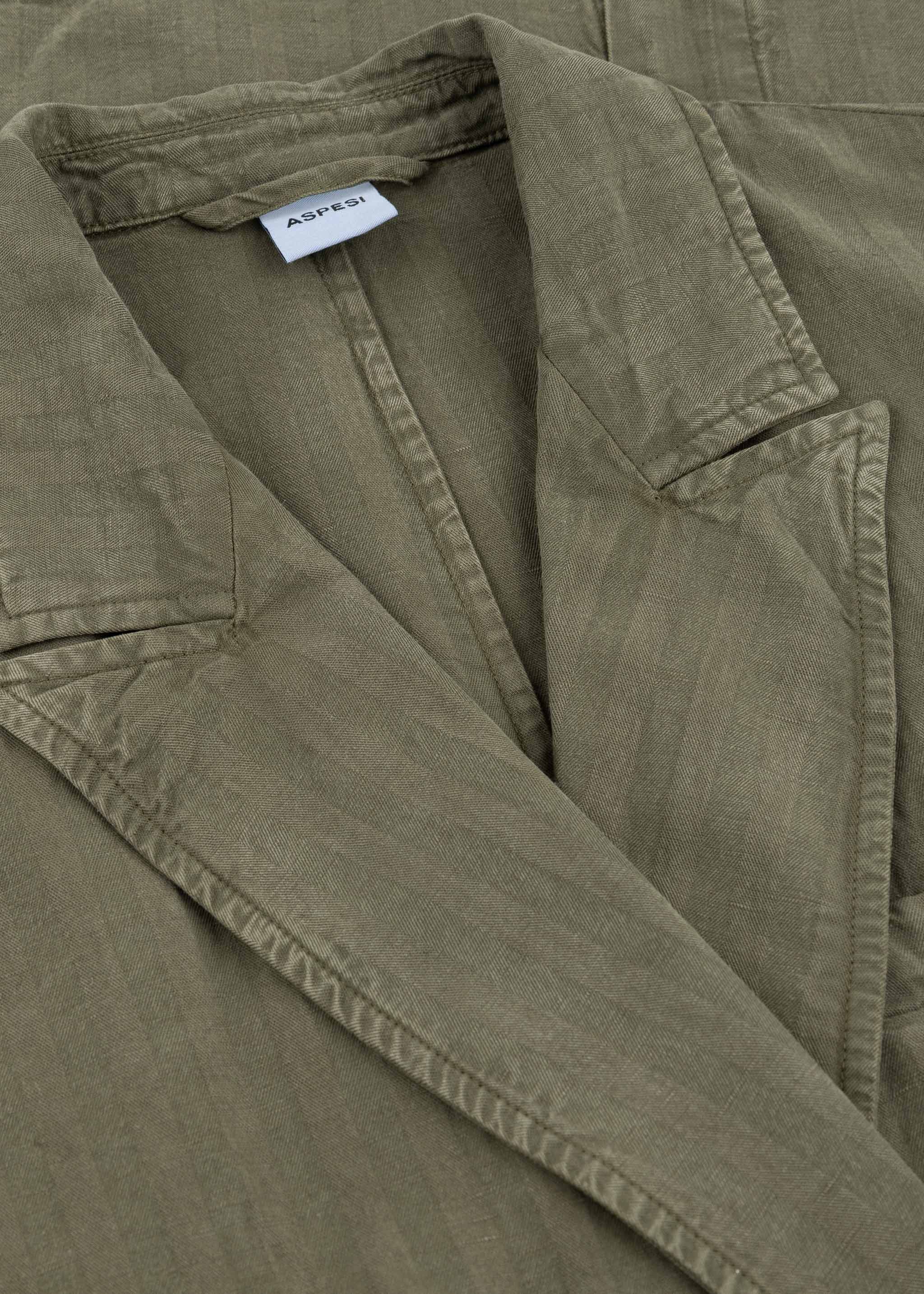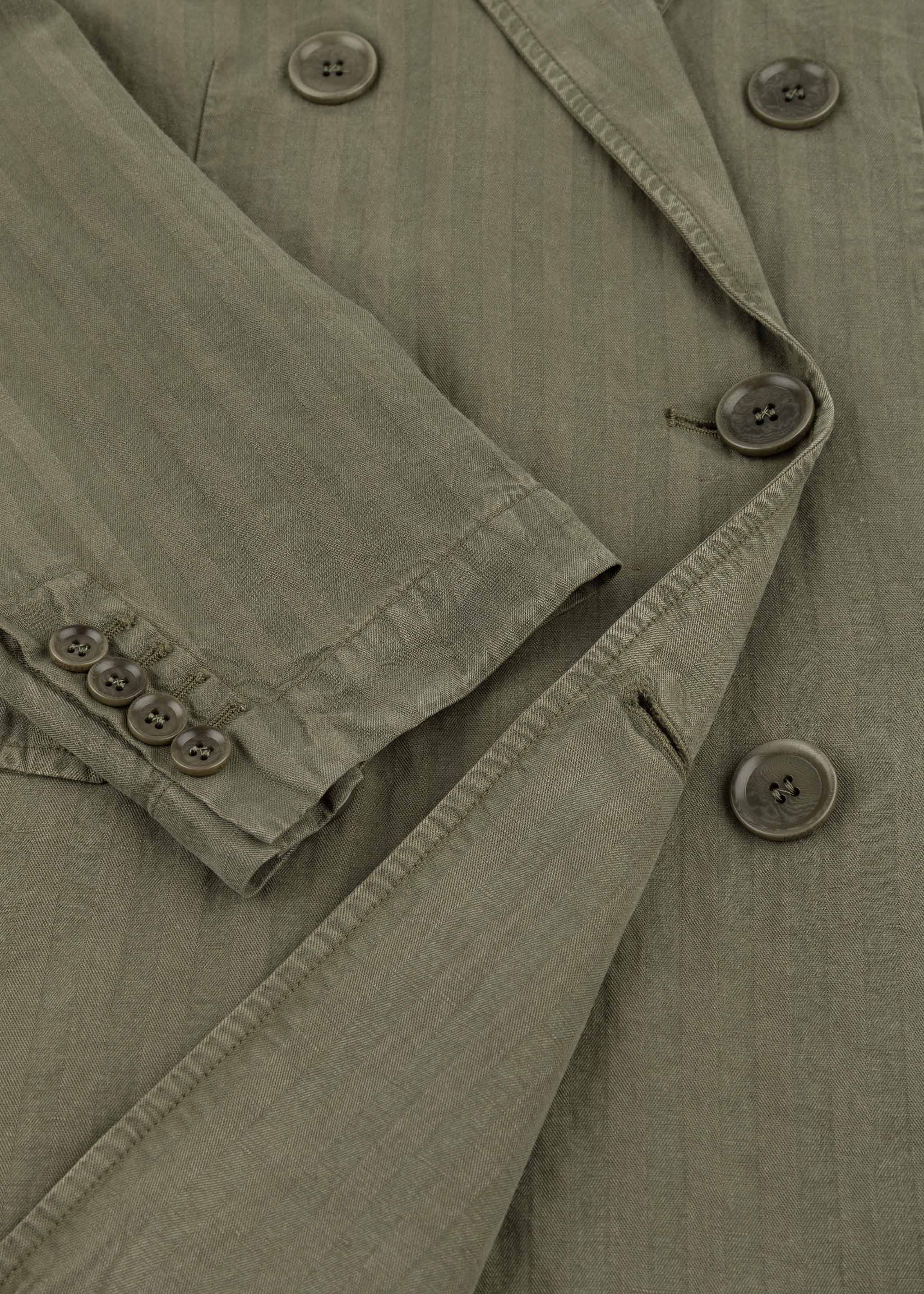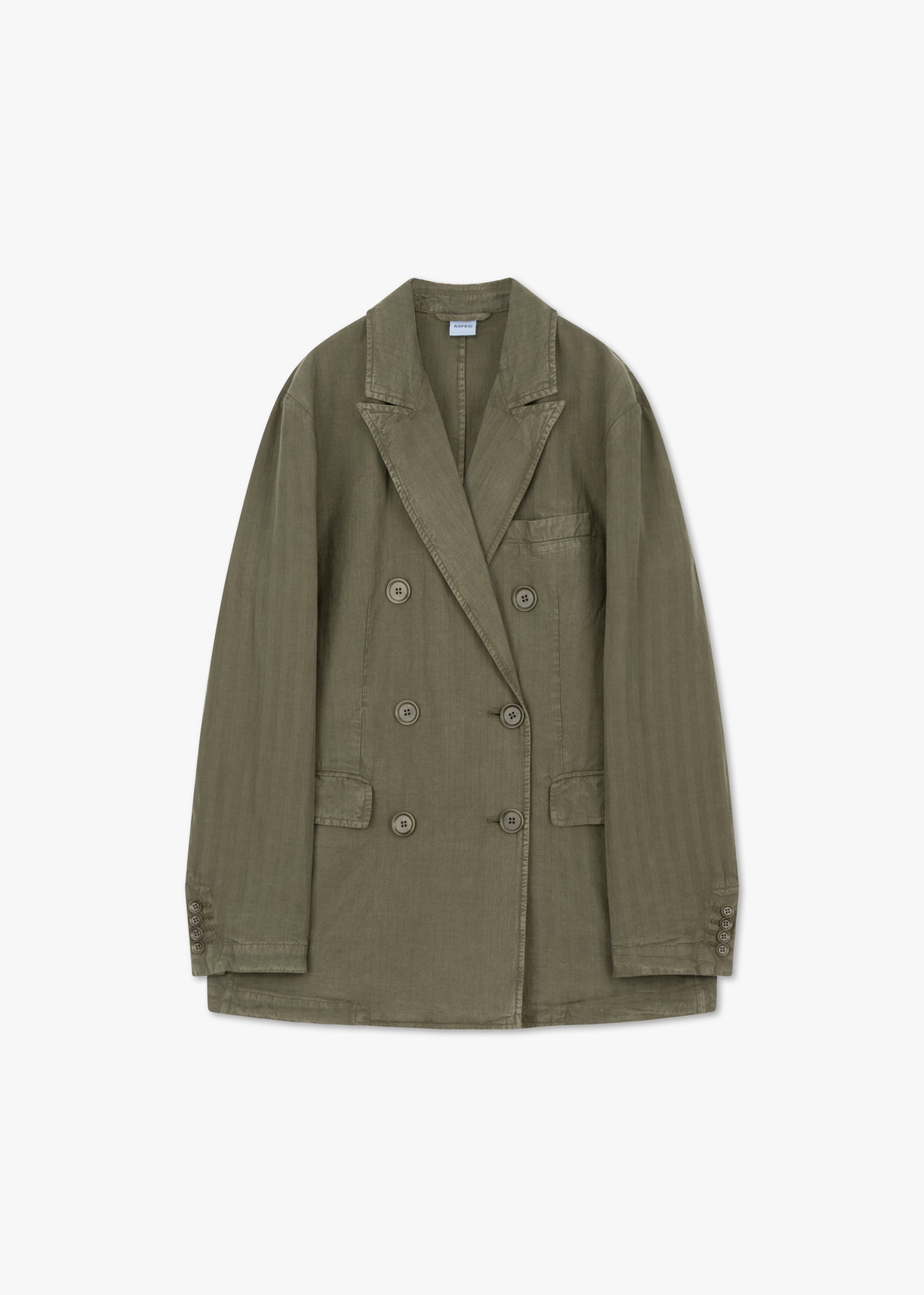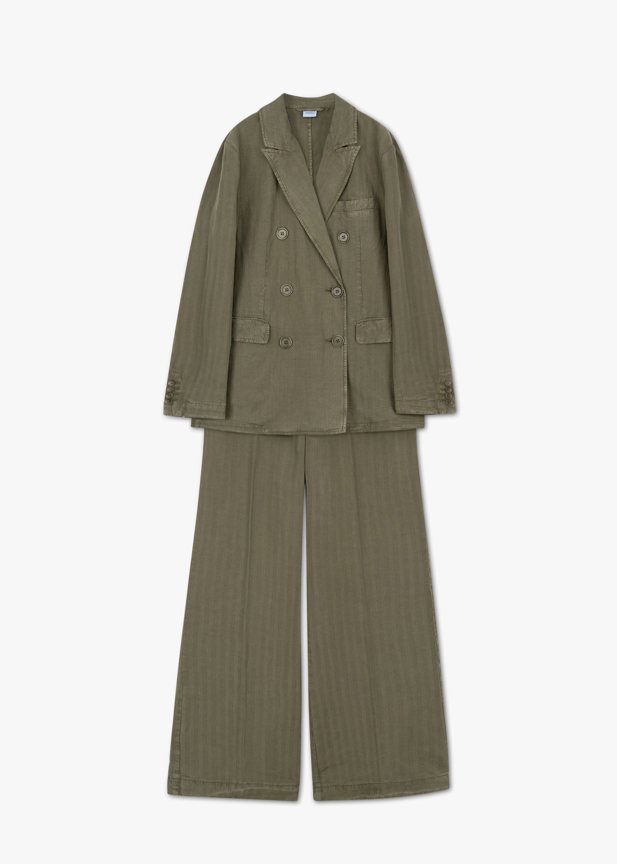 Relaxed suit set from Aspesi, double-breasted blazer, peaked lapel, slightly dropped shoulder, long sleeves with buttoned cuffs, one breast pocket, two flap pockets, straight hem with walking vent, unlined construction, soft feel.