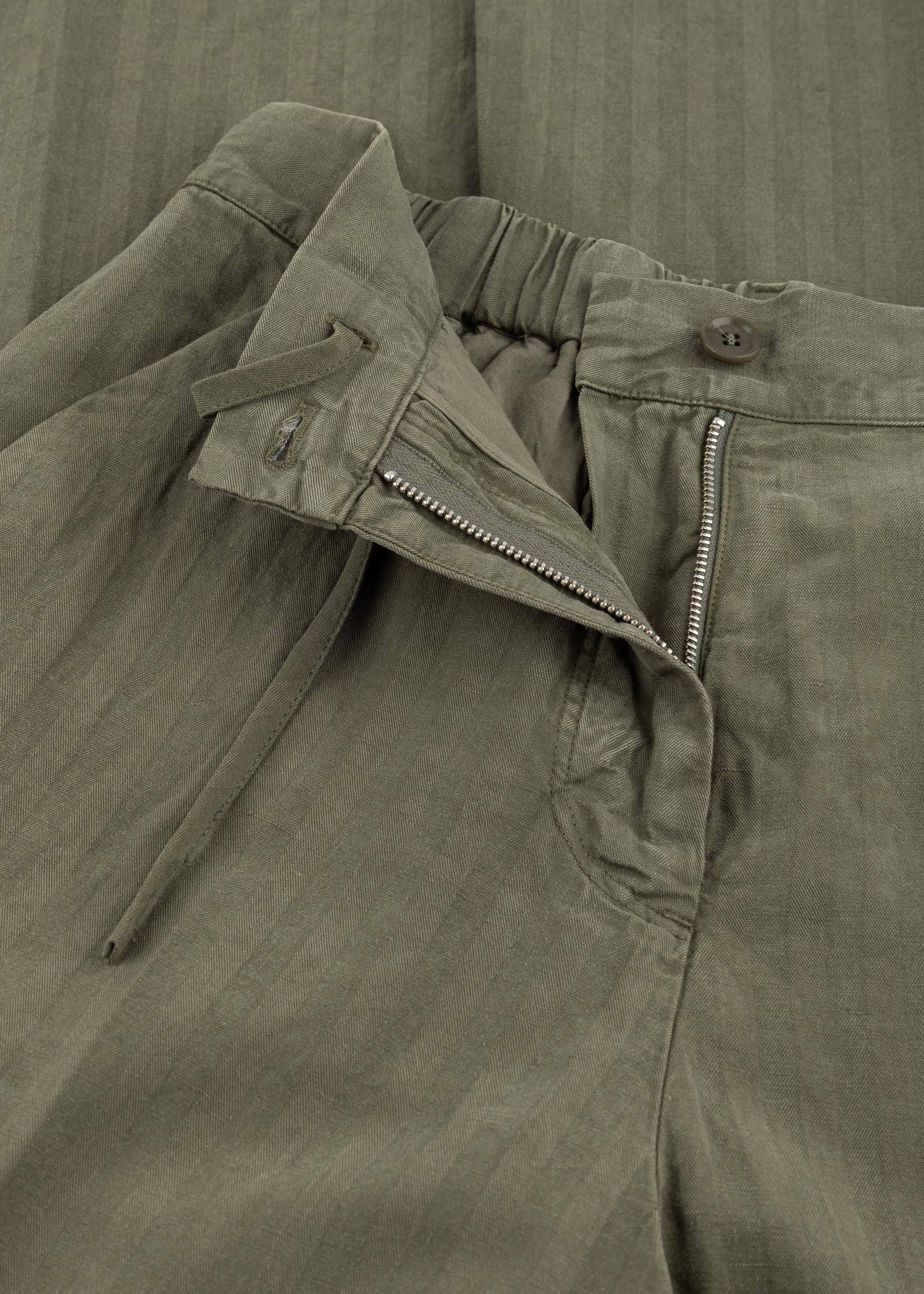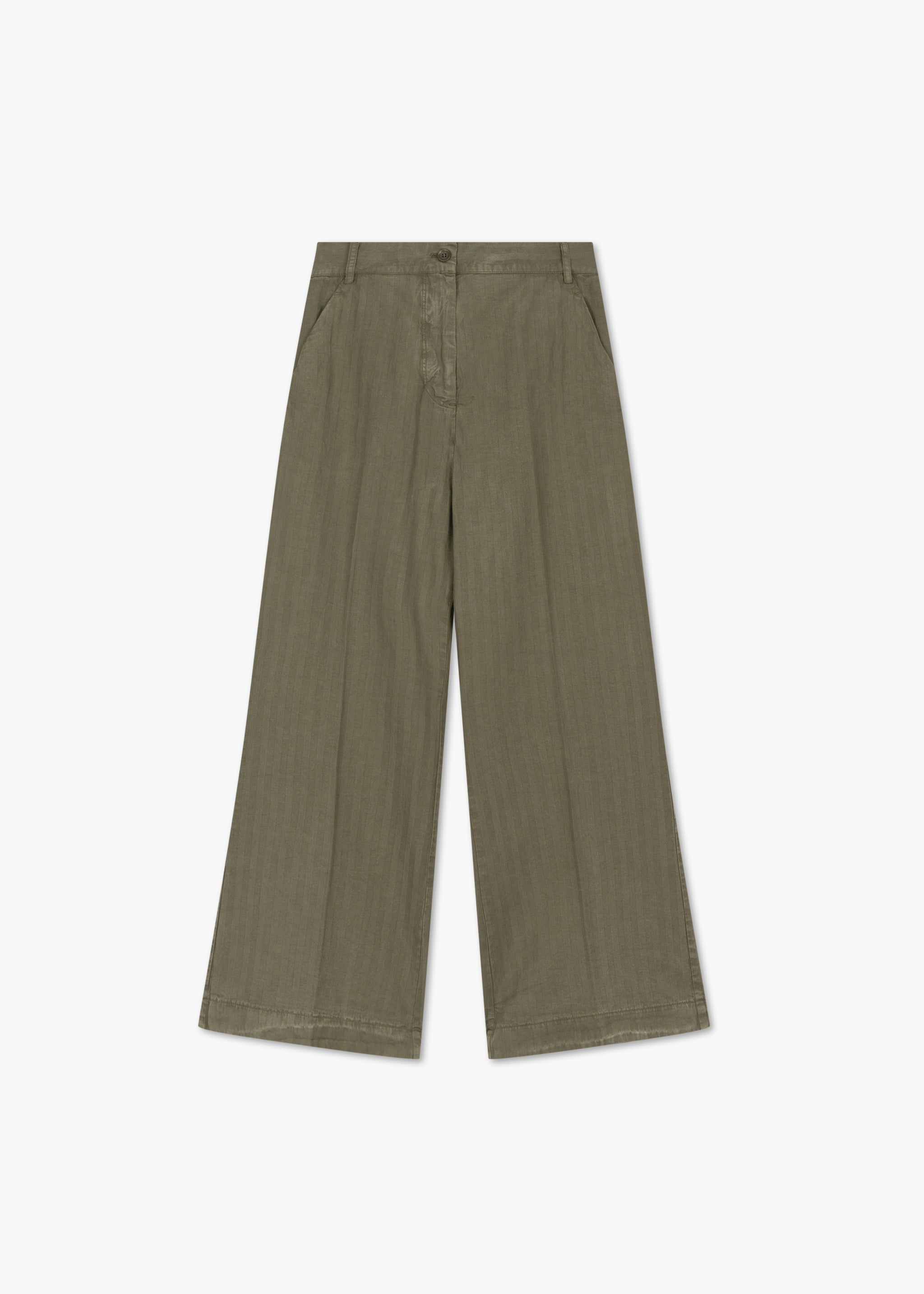 Ankle-length trousers, belt loops, elasticated waistband with drawstring, button and zip fastening, creases, side pockets, back pockets, wide leg, mid-rise waist.