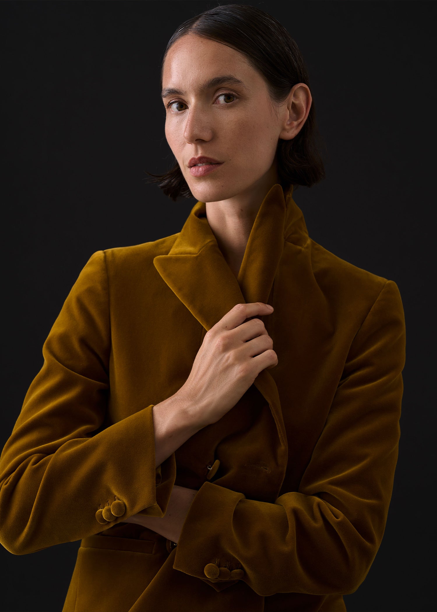 Long trousers 'Talita' by PiaLea made of shimmering velvet, with a hook and zip closure, waist darts at the back waistband, and side pockets.